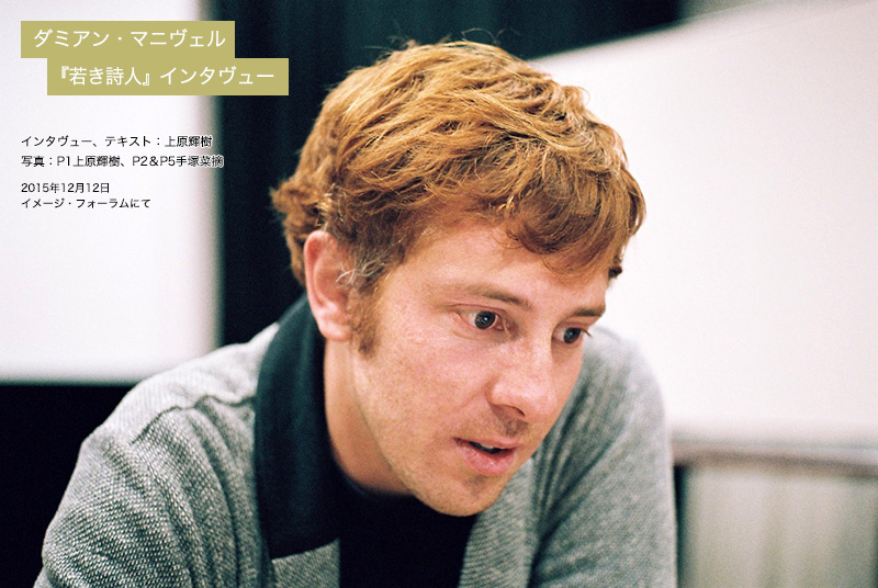 ![]() OUTSIDE IN TOKYO(以降OIT):ダミアンさんは、今回、1ヶ月半ほど日本に滞在されたということですが、映画作りという観点から、どのような感触を得ましたか? ダミアン・マニヴェル:母国フランスではない外国で、同じ年頃の映画を作っている人たちと、同じ情熱をシェアすることが出来て、とても楽しかったです。世界の映画祭に行くと同じようなことを感じるのですが、とても有意義な経験をしました。映画というものは、ひとつの国の中で撮らなければならないというものではなく、他の国の人たちと共有することが出来るものですから、違う国の人たちと共に、新しいものを取り入れていきたいと思っています。とりわけ僕の場合は、日本とは特別な関係にあると思っています。色々な人たちとの出会いがあり、友人もいます。幸い、『若き詩人』の評判も上々とのことですので、とても良い状況が生まれつつあると感じています。