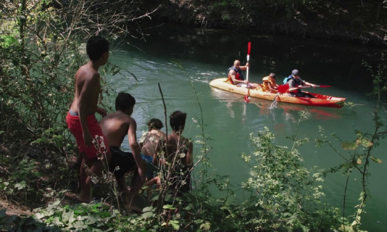 ギヨーム・ブラック:あの場面は完全に一度切りのドキュメントなのですが、あの場面に出てくる若者たちは、夏の間に何度も撮影しています。公園にいる女の子たちをナンパする男の子たちですね。それで彼らが水上スキーをやってみたいと言うので、私たちも一緒に行って、やっているところを撮影しようということになりました。ちょっとコメディのような面白いシーンになりましたね。 OIT:この映画は、子どもたちが親の同伴も許可証もなく公園に入ろうとして、警備員につまみ出される場面から始まります。その子どもたちはその後、何回もこの映画に登場して、警備員とイタチごっこを繰り返すわけですね。こうしたこと自体が、この“宝島”の楽しさのコアにあるように感じたのですが、監督ご自身も子どもの頃にこうした経験があったのでしょうか?