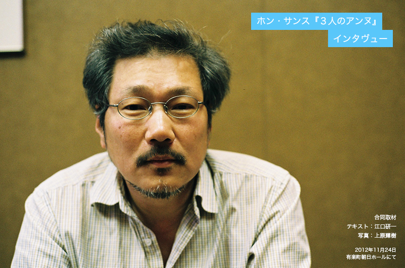 ![]() Q:先日、(韓国俳優の)ユ・ジュンサンに取材した折に、『浜辺の女』(06)の時に監督と長い時間一緒にいてたくさんお話をしたからきっと役をもらえると確信していたら、その時は役がもらえなくて悲しかったと話していました(笑)。結局は『よく知りもしないくせに』(09)(『ハハハ』(10)、『次の朝は他人』(11)でも)で役をもらえたそうですが、監督にとってキャスティングする際の俳優の決め方や基準、またその時はなぜユ・ジュンサンさんではなかったのかを教えてもらえますか? ホン・サンス:私がキャスティングをする場合、会った俳優が以前はどういう作品に出ていたか、あるいは韓国の大衆にその俳優がどういうイメージで受け取られているかなど、そういうことはあまり気にしません。それよりもまず、第一にその俳優と会った時の第一印象、つまりその俳優と会って他の人を思い出すこととかがありますよね。あっ、彼は誰々に似てるなとか、誰々を思わせるなとか。だからその俳優と会った時に色々なことを考えて思わせる第一印象と、あとは直感ですね。その俳優と会って起用したらこういうことができるんじゃないかとか、具体的ではないですけど、まずはその俳優に対する私の印象でキャスティングしているのだと思います。 Q:『浜辺の女』の時のユ・ジュンサンの場合は?