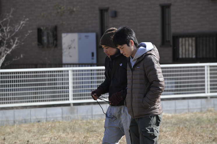 真利子:初めに脚本を読んでもらった時に分らないという感じ、分らないというのは悪い意味じゃなくて、何かこれを決定づけて進めていく役じゃないですよねっていう話はしてました。ただ実際に事件が起きた現場のロケ場所をスタッフも含めてツアーして回ってみるっていう事をやって、その時にお互い道中で、自殺についてとか、色々な話をしつつ海岸まで辿り着いて、とにかく台詞もないし、お互い掴む為にもという事で、歩き方だけを決めようって言って、一緒にこの男はどういう風に歩くんだろうという事を決めたんです。あの歩き方を決めたのはかなり自分の中でも大丈夫だと思うとこでもあったんで、きっと宮粼君も何か掴んだのかなと思ってます。