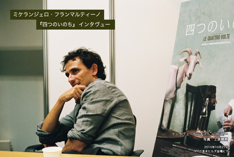 そんな映画を撮ったのがイタリアのミケランジェロ・フランマルティーノ。カラブリアに生きるふつうの人々を使い、不思議な映画を撮り上げた。2003年の『IL DONO』で成功をおさめた後、本作ではカンヌをはじめ、特に前評判もないまま、徐々に波紋を広げていった。何も起きないからこそ観客は見つめることに徹する。そして見つめるからこそ、ある生命のサイクルが浮かびあがる。そんな、ある意味、時代のスピードと逆行するような『四つのいのち』について聞いてみた。