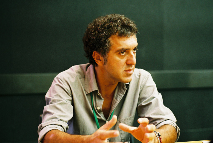 例えばこの映画(『コスモス』)についても、最初にシナリオを与えるのではなくて、先程のドグマということですけど、ドグマ性がないようにと、シナリオをまず与えずに彼らにはあたかも鳥が鳴くように鳴いてごらんと、それだけを言いました。それで、彼らも自分達で研究して、こんなのどうだという風に私に提案してくれる。彼らも楽しんでやってくれました。私は、そういうことが出来る人達を常に探しているのです。開かれている俳優さん達を。(ふたりの男女が叫び合うシーンの場面写真を指差して)このシーンはとても典型的ですが、凝り固まらずに、こういう挑戦が出来る人達なのです。