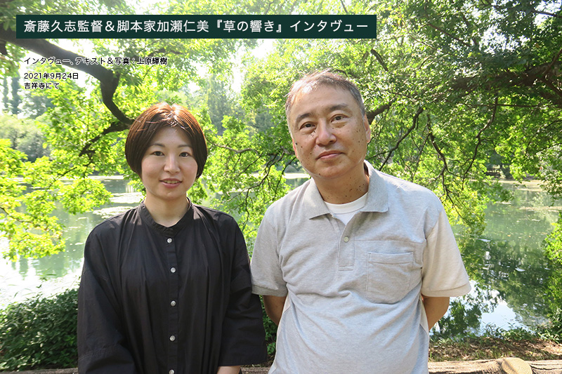 この企画は彼が参加したことで本格的に動き出したという、主人公の和雄を演じる東出昌大、和雄の友人研二を繊細さと表裏一体の朗らかさで演じる大東駿介、和雄の妻を圧倒的な素晴らしい存在感で演じる奈緒、この三人の素晴らしい演技アンサンブルに加えて、若き三人組、彰、弘斗、恵美を演じるKaya、林裕太、三根有葵の儚くも美しい存在感、そして、舞台となった函館の街の土地勘を立体的にイメージさせるように見事に構成された画面構成、日本インディペンデント映画の啓明期から活躍を続けているキャメラマン石井勲と照明を手掛ける大坂章夫の抜群のコンビネーション、そうした全てがこの映画を特別なものにしている。今回は、斎藤久志監督に加えて、奥様であり本作の脚本家でもある加瀬仁美さんにもご同席頂いて、傑作『草の響き』についてお話を伺った。