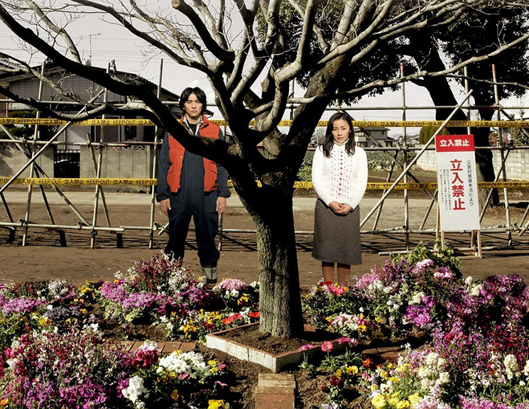 園子温:前半は反映したというよりは、忠実に再現したとこもあったりする。だから取材した人達の自分の身に起きたエピソードをそのまま使っていたりするんです。例えば庭のど真ん中で20km圏内と圏外に分かれたシーンは、実際にある人の庭がそのような境遇だったのでそれをそのまま生かしました。その庭では圏内と圏外で自分の庭が分かれちゃったんで、圏外の方は花が凄くきれいに咲き乱れてるけど、圏内の方は枯れてるんです。そんな不条理な自宅の庭を持ってる方に会った時に、これはあんまり報道されないけど、あのコンパスの丸いやつっていうのはどんなことを起こしてるか、放射能の不条理さを表すのはこれだなって思いましたね。何度もそこのお母さんとお会いしながら、彼女の歴史を軸にしてこの映画を撮っていったんです。