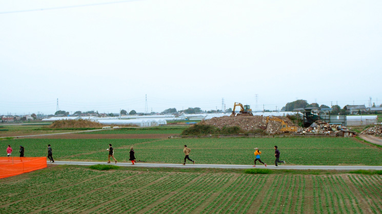 まずは『ジョギング渡り鳥』という昔書いたプロットがありきで、このOLの純子っていうのは誰かがやるけど、他の人達も今からリハをやってエチュードをやってもらって、どういう職業についているのか、誰と誰が関係があるのか、2〜3人は顔見知りで仲が悪かったり、ここはじゃあお茶を配ってる夫婦にしようとかっていうことを徐々に11月くらいからみんなで集まっては毎日エチュードを始めてったんです。中にはプテラノドン出したいとか、変な設定を言い出す人もいたりしながら、それこそ本当に厳密にシナリオを書くっていう作業だと、はまっていかないのばっかりなので、整合性がとれていなくてもいいから、とにかく足し算で作っていくっていう感覚で始めていったんです。それで年明けの1月、埼玉県深谷市の深谷フィルムコミッションの強瀬さんっていう人にこういう映画撮りたいんだけどって言って、合宿で撮りに行く、どうなるのかは全く分からない、ただこの十何人かの“間”にあるものを撮りたいんだけど、はっきり台本が決まっているものでもないし、撮影までには大雑把な流れのストーリーは出来てたんですけど、完璧に出来上がってるものではなくて、すごく隙間の多いシナリオで、それを元に撮影しながら変わっていっても構わない、ごっこみたいなことを始めたいっていう風にして始めた。それって実はすごく面倒くさいことなんですけど、みんなでそれを撮影して、みんなで終えて、みんなで移動して、みんなで飯作るっていう、効率の悪いことをやりたいっていう申し出をして、それで撮影が始まったんです。
