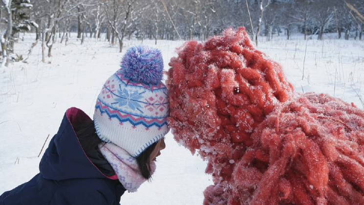 吉開菜央:音に関しては、燃える音とか蒸気の音とか、熱を感じるような音は見つけたら録っておいてくださいというお願いは松本さんにしていましたが、基本的には松本さんにほぼお任せという状態でした。撮影に関しては、事前にロケハンをした後、まず斜里に着いて実際にどこで撮ろうかっていう時に、40年に一度の小雪で全然雪がない、普段だったらもう真っ白なんだけど、みたいなところばっかりだったんです。それで最初に考えてたアイディアでやり切るのは難しそうだなと思って渡辺さん達と話してる内に、この異常気象も“赤いやつ”が呼び寄せたような流れにする?ということを思い付いて、全体を練り直してます。撮影で現地に行ってからも脚本を少し書き直して、それを香盤化して撮りました。ちゃんと準備して撮影する必要があるシーンを香盤化してきっちり撮り終わった後は、予定になかったエクストラカットがどんどん増えていって、エクストラを撮りまくる日々でした。