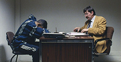 『現行犯』(Délits fl agrants) 1994年/フランス/109分/カラー/デジタル/英語字幕 監督:レイモン・ドゥパルドン 警察によって現行犯逮捕された人たちが留置所に到着してから、弁護士と面会するまでの一連の流れについてのドキュメンタリーで、パリの裁判所で撮影されている。スリを行った者もいれば、麻薬中毒者、DVの夫、不法移民もいる。不意に検察官と向かい合わせになった15件の軽犯罪容疑の被告人たちが狭い部屋で尋問される様子が長まわし固定ショットでとらえられる。ドゥパルドンのキャメラは映されている人たちがほとんど意識しなくなるほど控え目でありながら、怯える者もいれば、卑怯そうな、ずる賢い者もいる被疑者たちや検察官たちのやり取りの中から彼らの人間性を浮かび上がらせる。 |