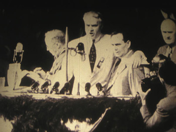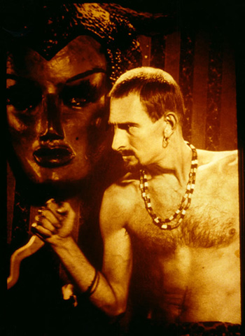 | 『ノー・プレジデント』 ジャック・スミス / 1967-70 / 16ミリ / b&w / 50分(アメリカ) 『燃え上がる生物』の続編ともいえるジャック・スミスの長編第2作目。1930年代のホラー映画から飛び出してきたモンスター、そして人魚や好色漢たちが、人間の想像の奥底に眠る極彩色の楽園で響宴を繰り広げる。ハリウッドB級映画の女王マリア・モンテスへのスミスのあこがれを具現化したとも言える作品。 |