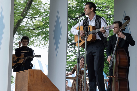 当時既に大スターとしてフォークミュージック・シーンに君臨していたジョーン・バエズ(モニカ・バルバロ)が颯爽と登場する姿を捉える、マンゴールド監督とは『アイデンティティー』(2003)以来、20年以上の付き合いになる撮影監督フェドン・パパマイケルによる移動撮影が素晴らしい。ヴィレッジのライブハウス「フォークシティ」に、開演僅か5分前に余裕の表情で駆け付けた彼女は大物マネージャーであるアルバート・グロスマン(ダン・フォグラー)を、(グロスマンにしてみれば不当にも)適当にあしらった後、ステージに立ち、「朝日のあたる家」を歌い、満場の喝采を浴びる。出番を控えていたまだ無名の若者ディランは、バエズと入れ違いざまに簡単な挨拶を交わすが、バエズはディランの雰囲気のある存在感を気に留めながらも、その気持ちを吹っ切るかのように、足早に会場を立ち去ろうとする。そこでディランは、「いい演奏だった」と聴衆の前でバエズに対して賛辞を送り、そのまま立ち去るわけに行かなくなった彼女は足を止める。ディランはさらに「その上、とても美しい」と付け加え、「I was Young When I Left Home」を歌い出す。立ち去ろうとしていたバエズは、ディランのパフォーマンスに心を奪われ、二人の間には特別な感情が渦を巻くように芽生えていく。この俄かに香り立つ豊かな官能性が辺り一面を支配していく場面を、緊張感のある視線の演出と音楽の力の相乗効果で盛り上げるジェームズ・マンゴールの演出手腕が素晴らしい。